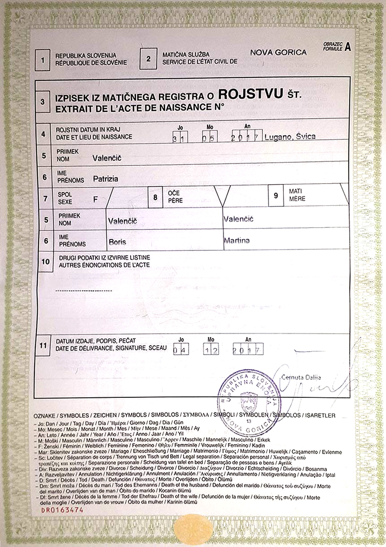in zvezno vlado. Rojstni list nama je izdal šele 10.11.2017. Ta Luca
